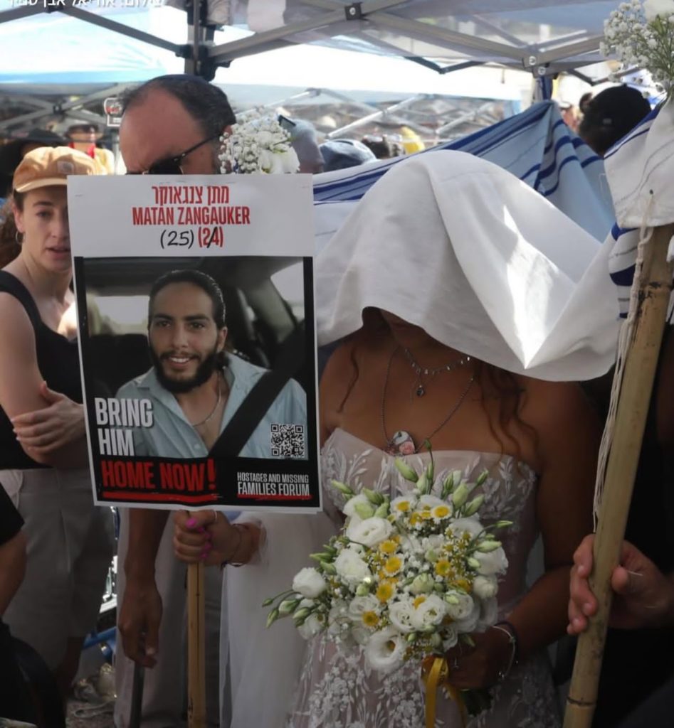 La exrehén israelí Ilana Gritzewsky protagonizó un emotivo acto en Tel Aviv al organizar una boda simbólica para recordar a su pareja, Matan Zangauker, quien permanece cautivo en Gaza desde hace meses.