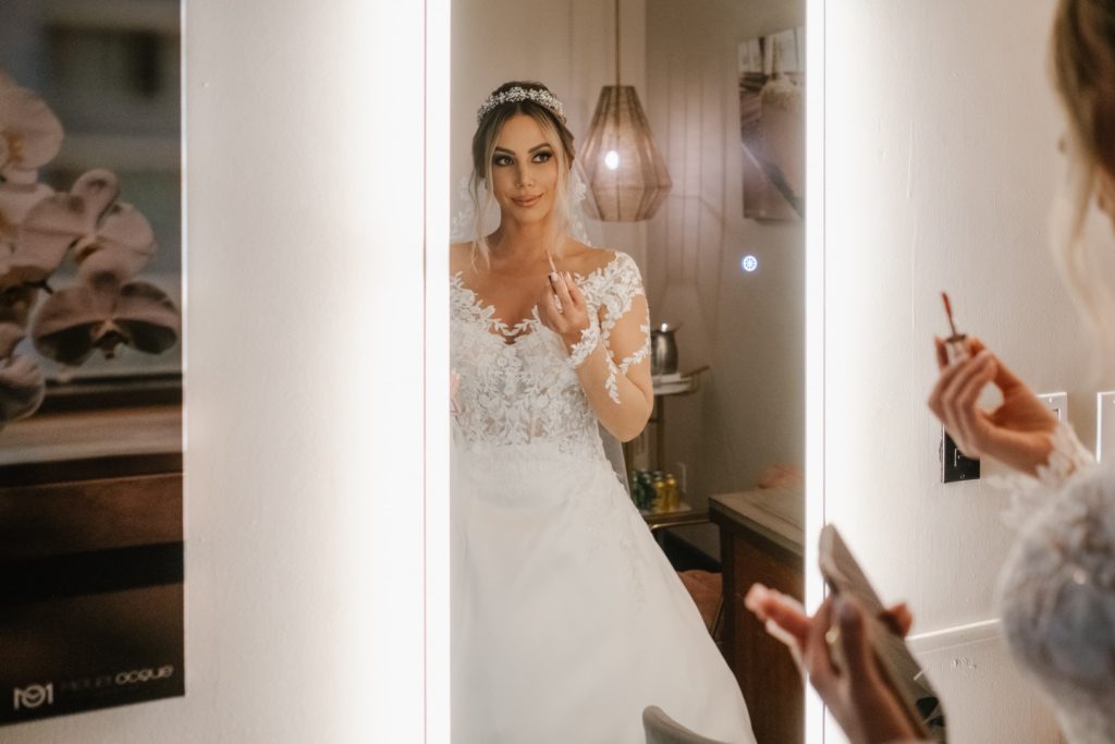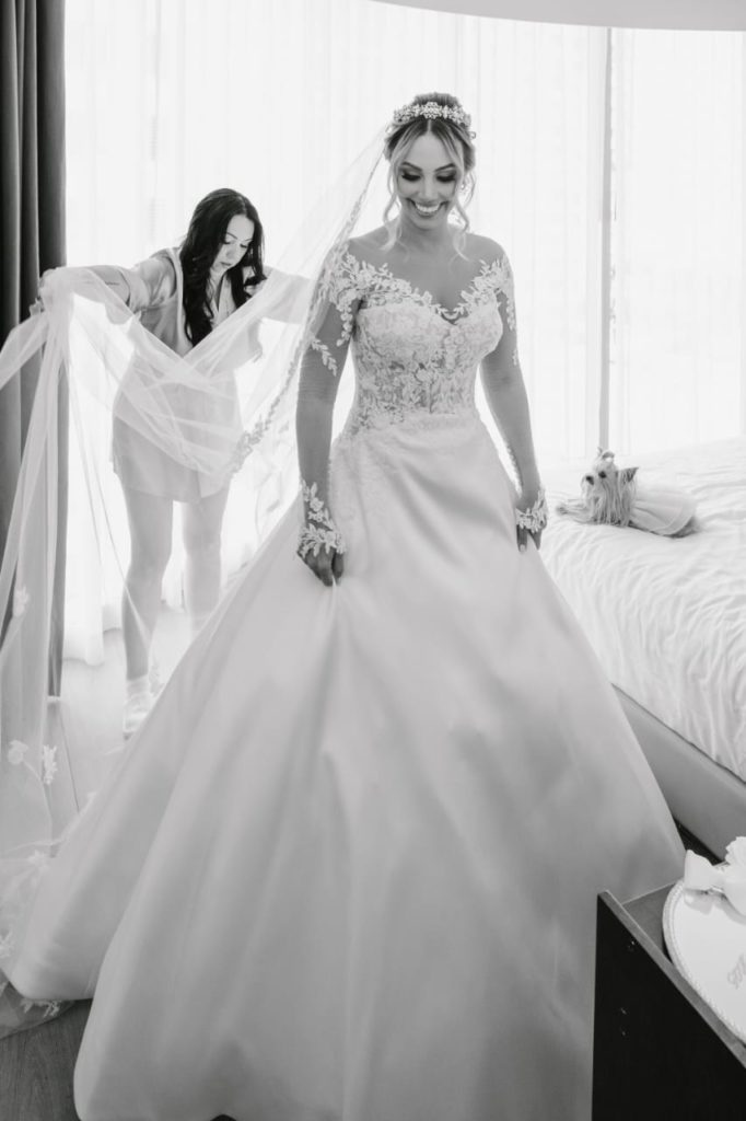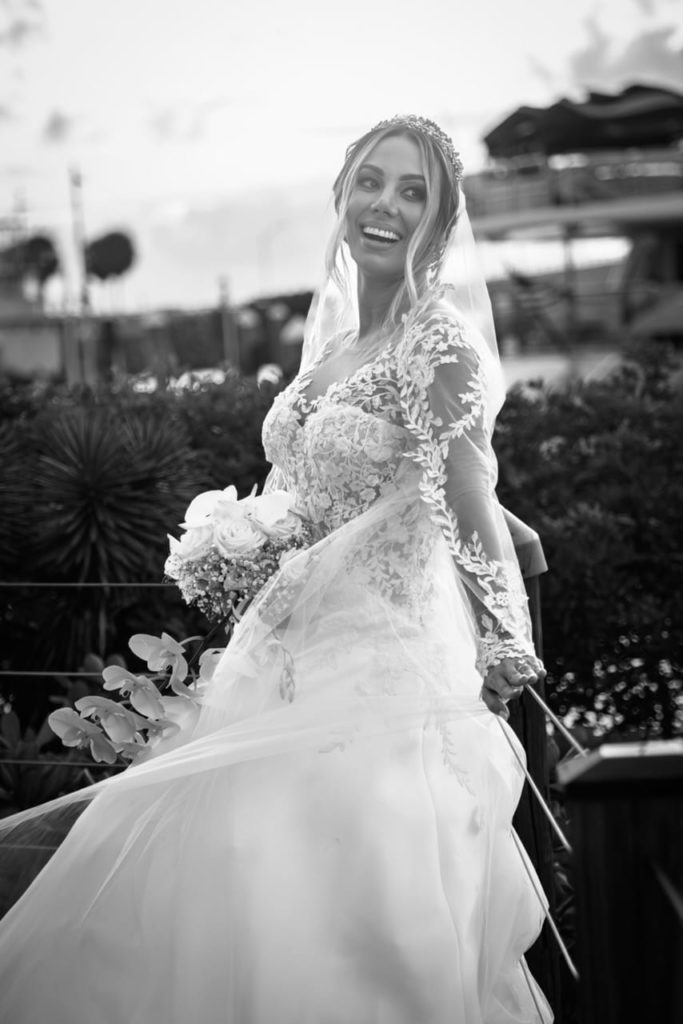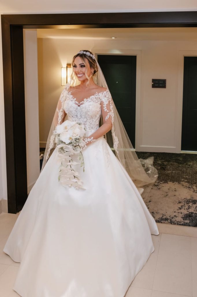 Madeleinne lució un vestido de Pronovias, personalizado junto a la casa de diseño. Las mangas, el velo y los detalles exclusivos transformaron un vestido hermoso en uno verdaderamente perfecto.