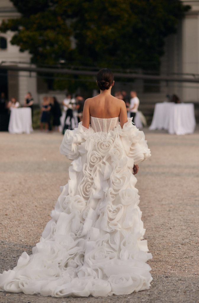 - Texturas exuberantes: terciopelo, bordados, flores voluminosas, detalles escultóricos.