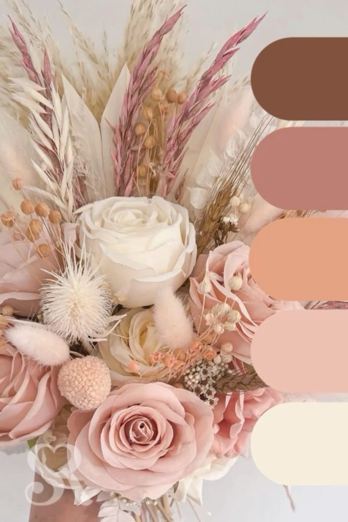 Colores como terracota, beige, verde oliva y marrón están en auge. Estas tonalidades evocan una conexión con la naturaleza y son perfectas para bodas al aire libre.